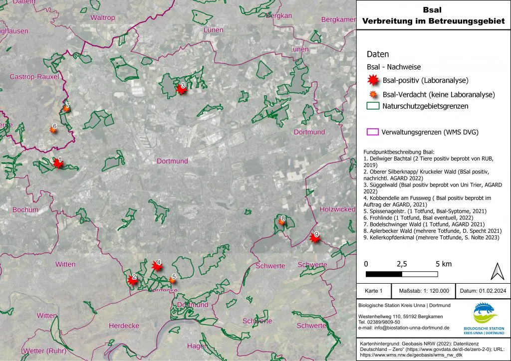 Die „Salamanderpest“ hat sich in den letzten Jahren sukzessive in östlicher Richtung im Ruhrgebiet ausgebreitet. Auch Vorkommen im Dortmunder Stadtgebiet sind bereits seit einigen Jahren bekannt. Ganz aktuell wurde nun über Laboranalysen auch der erste Bsal-Ausbruch im Kreis Unna bestätigt (Kellerkopf-Denkmal, Holzwickede), nachdem ein aufmerksamer Bürger tote Feuersalamander gemeldet hatte. Eine weitere Ausbreitung in östlicher Richtung, wo der Pilz bisher noch nicht nachgewiesen wurde, ist sehr wahrscheinlich.